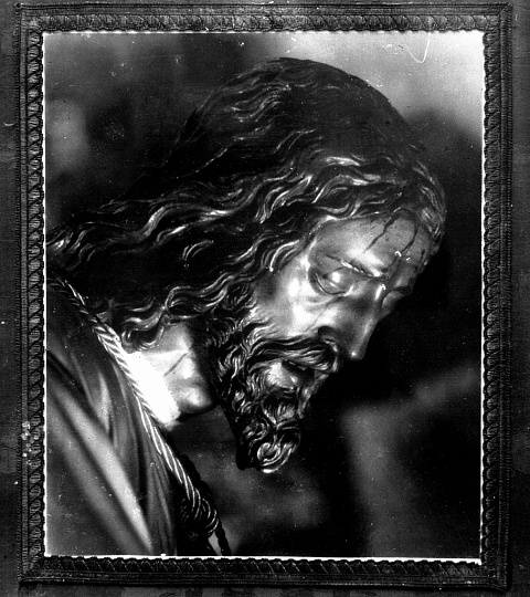 Antigua fotografía, en blanco y negro, de una primer plano de Nuestro Padre Jesús de la...