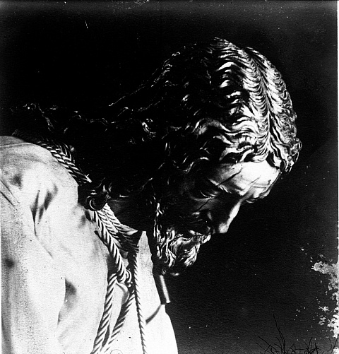 Antigua fotografía de primer plano de Nuestro Padre Jesús de la Pasión. Blanco y negro.