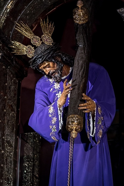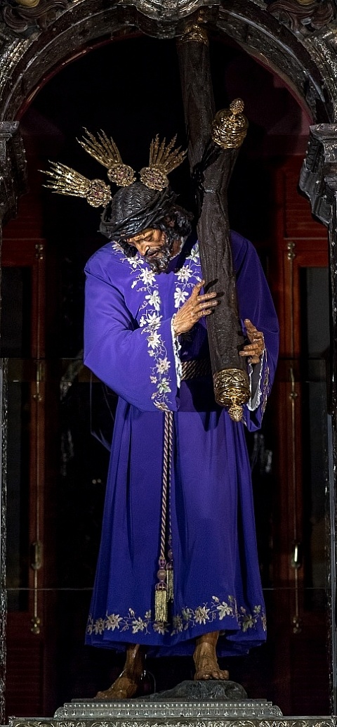 Nuestro Padre Jesús de la Pasión en su capilla con la túnica de seda y las potencias de...