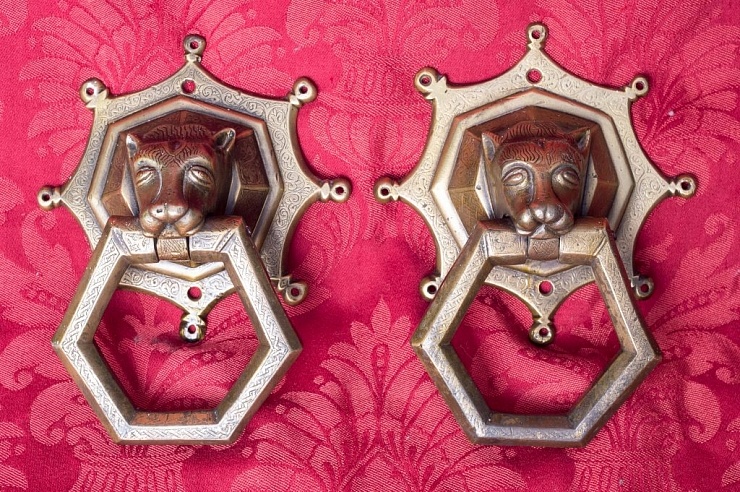 Piezas únicas en su género, proceden de la primitiva mezquita aljama de Ibn Adabbas, sobre la que se edificó la actual Colegial del Divino Salvador. De la boca de ambos leones pende la aldaba, un hexágono irregular, fijándose a la puerta por medio de un polígono estrellado en cuyas puntas se fijan los clavos.