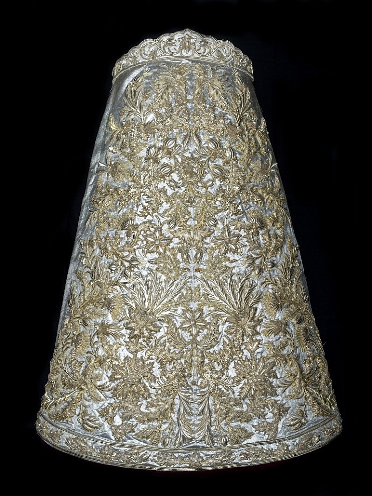 vestía preferentemente el 24 de septiembre, día de su festividad. Cuando hubo de pasarse la saya de salida a nuevo tejido, se eligió a tal fin esta pieza de gran valor histórico y sentimental, en el que junto a la calidad de los bordados se une lo excepcional del soporte.
