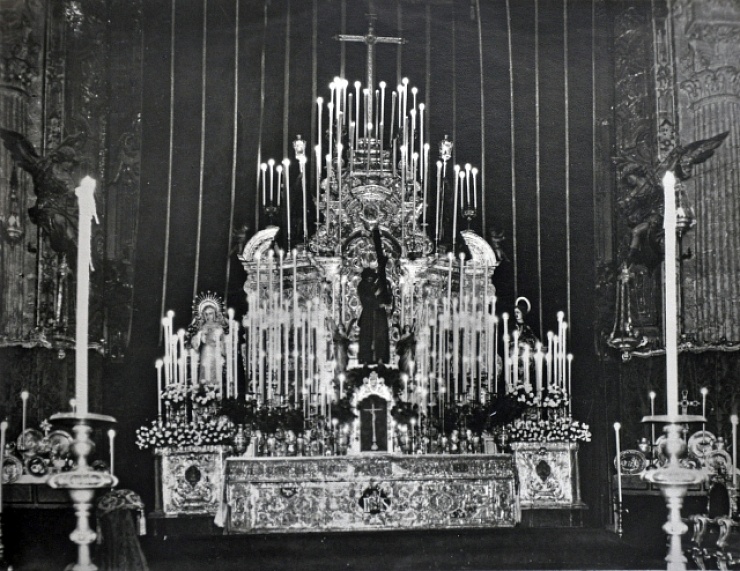 Como curiosidad está montado con el altar de plata (actualmente en la Capilla Sacramental) y con la custodia rematando la parte superior con la antigua cruz de guía.