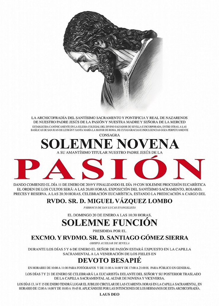 Novena. Del viernes 11 al sábado 19 de enero, se celebrará la Solemne Novena consagrada a Nuestro Padre Jesús de la Pasión desde 1848. Los cultos darán comienzo a las 20 horas, con el siguiente orden: Exposición del Santísimo Sacramento, rezo del Santo Rosario, bendición solemne, preces y reserva. A continuación, Santa Misa predicada por D. Miguel Vázquez Lombo, Párroco de san Lucas Evangelista. A la conclusión, canto del Christus Factus Est.