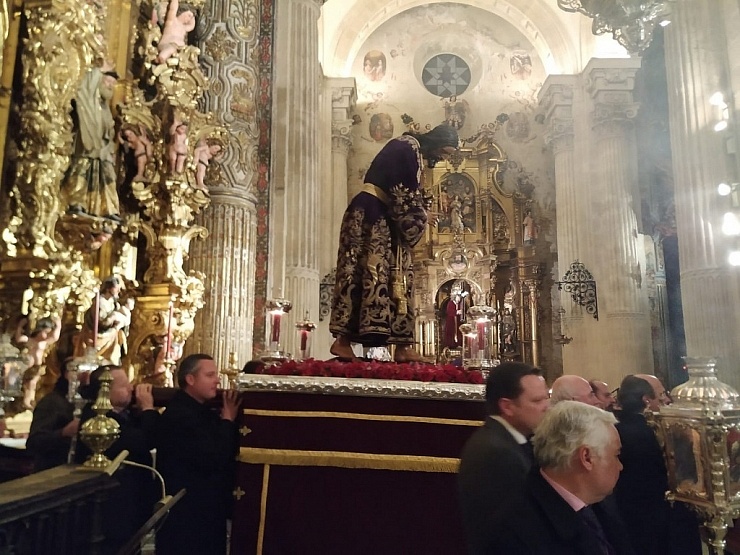 Fotografía, de Cristina Yanes, del traslado de Nuestro Padre Jesús de la Pasión al al Altar Mayor de la Colegial del Divino Salvador en la tarde del 7 de enero de 2019.