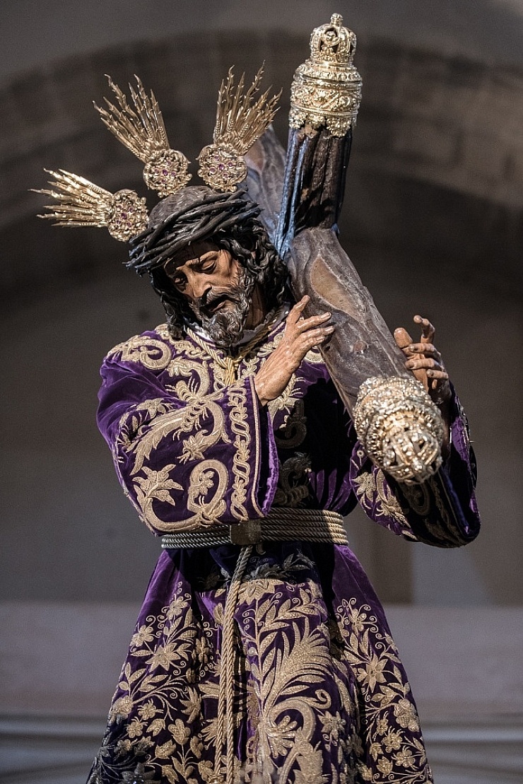 Fotografía de Nuestro Padre Jesús de la Pasión con cruz, la túnica de Ariza y las potencias de novena.