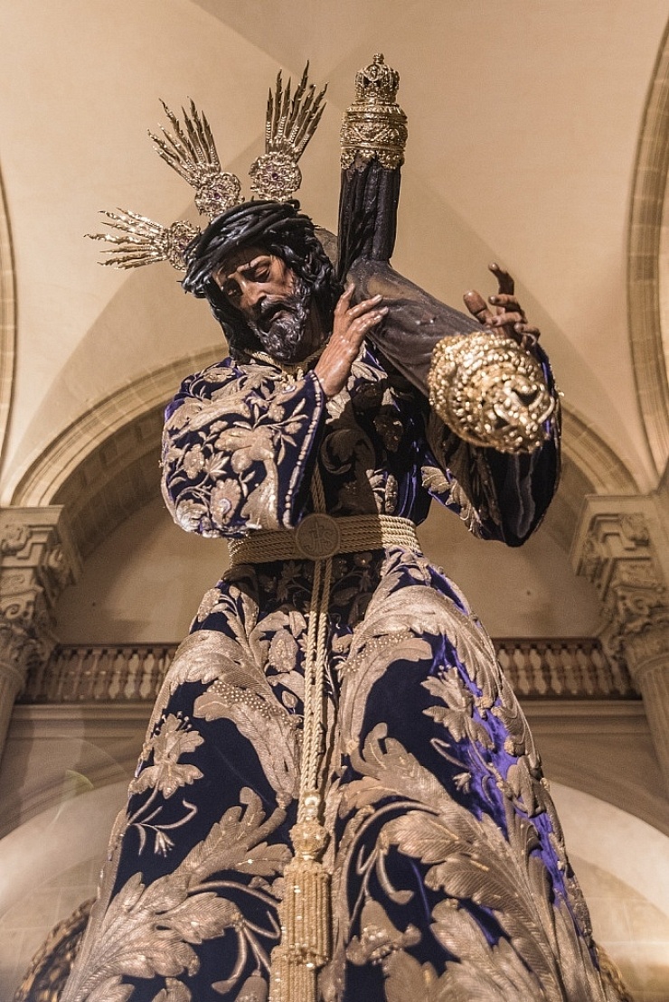 Fotografía de Nuestro Padre Jesús de la Pasión con cruz, la túnica de los acantos de Patrocinio López y las potencias de novena.