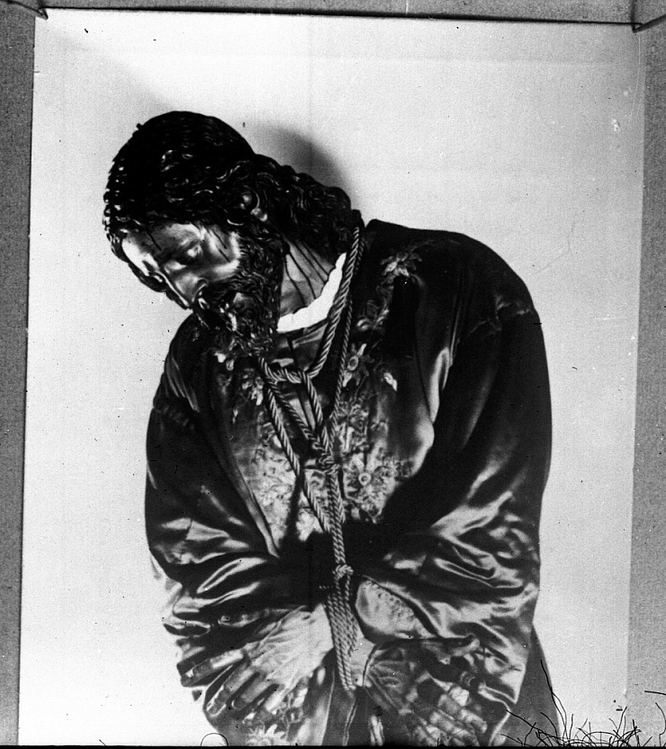 Antigua fotografía en blanco y negro de Nuestro Padre Jesús de la Pasión de medio cuerpo con la túnica de seda.