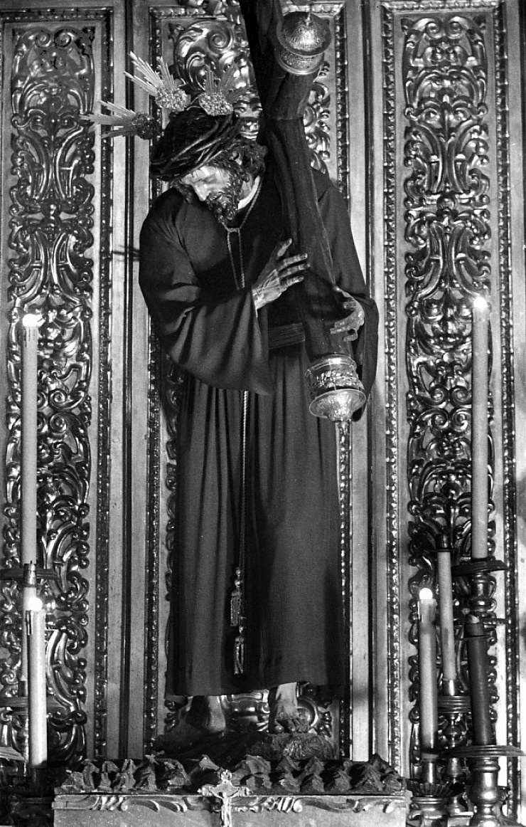 Fotografía, en blanco y negro, de cuerpo entero del Señor en el antiguo retablo de la Capilla Sacramental.