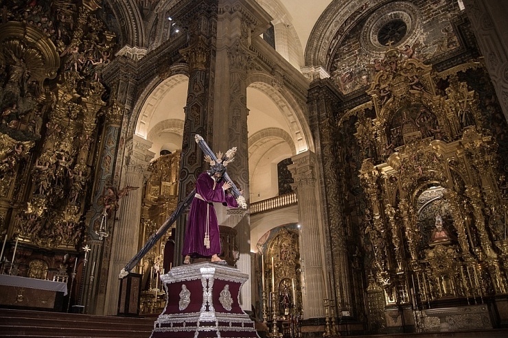 Nuestro Padre Jesús de la Pasión, en su peana, en la Colegial del Salvador con la cruz de salida, potencias de salida y túnica lisa.