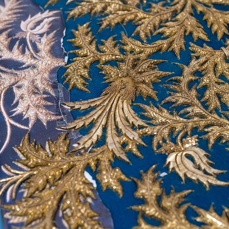 15 de julio de 2019. Seguimiento, de la Comisión designada por la Hermandad, de la restauración del techo de palio en el taller del bordador Jesús Rosado en Écija.