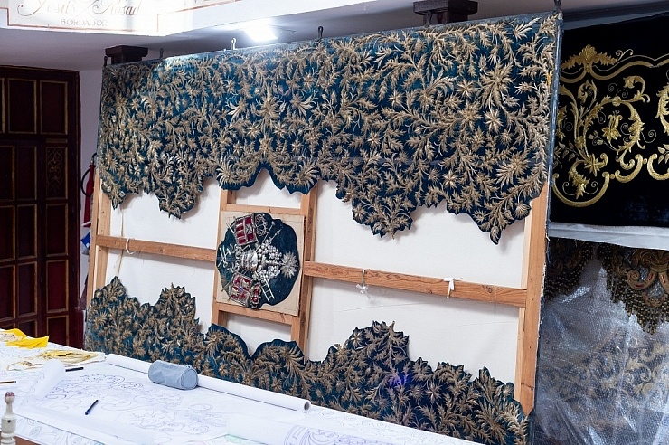 15 de julio de 2019. Seguimiento, de la Comisión designada por la Hermandad, de la restauración del techo de palio en el taller del bordador Jesús Rosado en Écija.