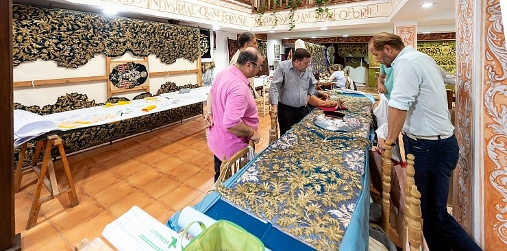 15 de julio de 2019. Seguimiento, de la Comisión designada por la Hermandad, de la restauración del techo de palio en el taller del bordador Jesús Rosado en Écija.
