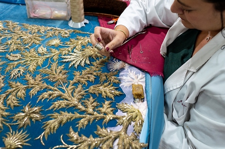23 de octubre de 2019. Seguimiento, de la Comisión designada por la Hermandad, de la restauración del techo de palio en el taller del bordador Jesús Rosado en Écija.