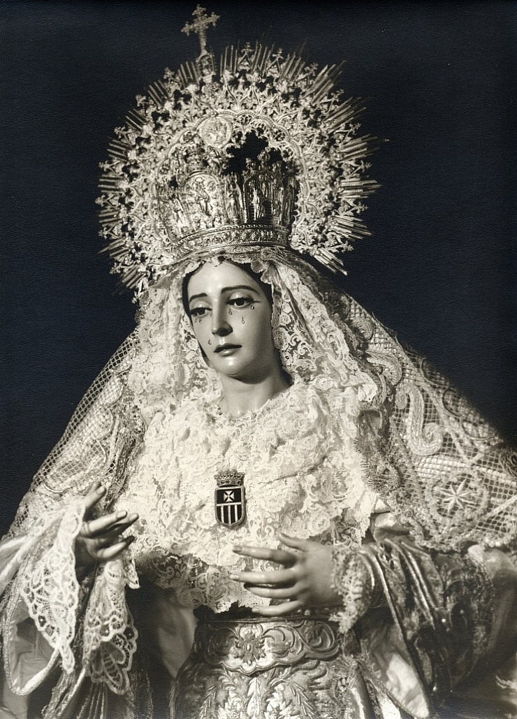 Fotografía en blanco y negro de Nuestra Madre y Señora de la Merced de medio cuerpo.